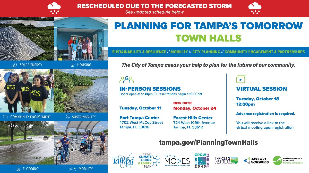 Please join us at one of the in-person sessions or at the virtual session. You can register by visiting www.tampa.gov/planningtownhalls: