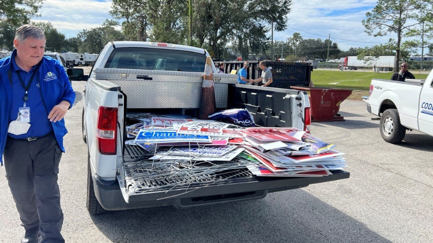 Collected signs were dropped off at the Hillsborough Heights Solid Waste Facility and Community Collection Center, 6209 County Road 579, Seffner, FL 33584.